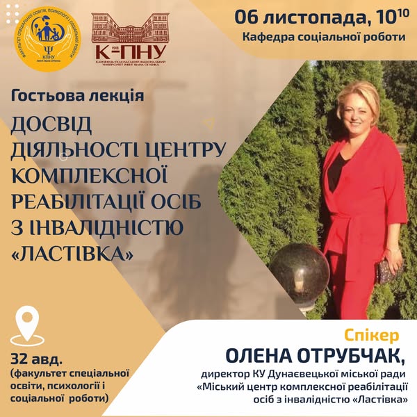 06 листопада відбулася гостьова лекція для здобувачів вищої освіти спеціальностей 231 Соціальна робота та 232 Соціальне забезпечення та науково-педагогічних працівників. Тема лекції: Досвід діяльності Центру комплексної реабілітації осіб з інвалідністю «Ластівка». Спікером заходу виступила директор КУ Дунаєвецькоі міської ради «Міський центр комплексної реабілітації осіб з інвалідністю «Ластівка» – Олена Отрубчак